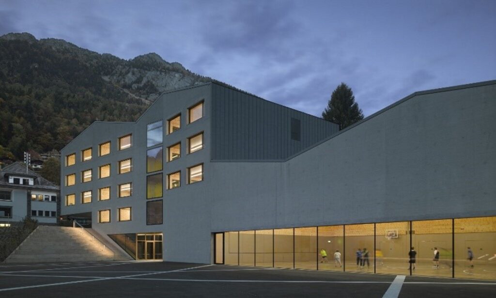 Trois entrées ponctuant la longueur, permettant de gérer les différents usages, scolaire, associatif et public. L’école de trois étages sur rez, offre trois classes par niveau, deux salles normales et une salle spéciale. La matérialisation s’inspire des maisons villageoises en maçonnerie crépie et toiture en métal ardoisé.